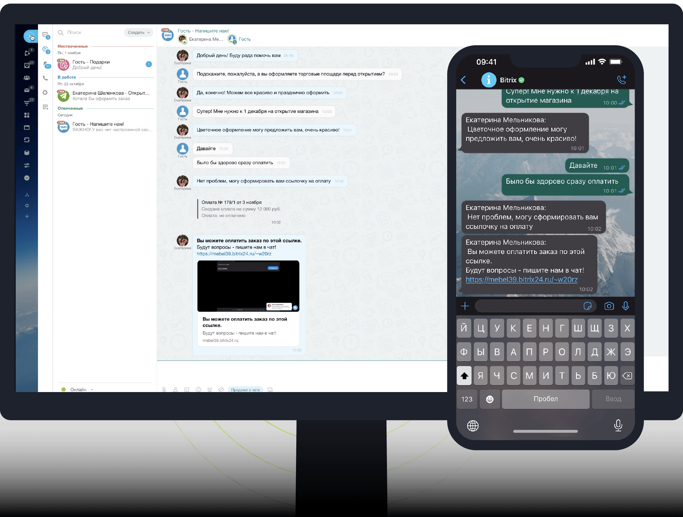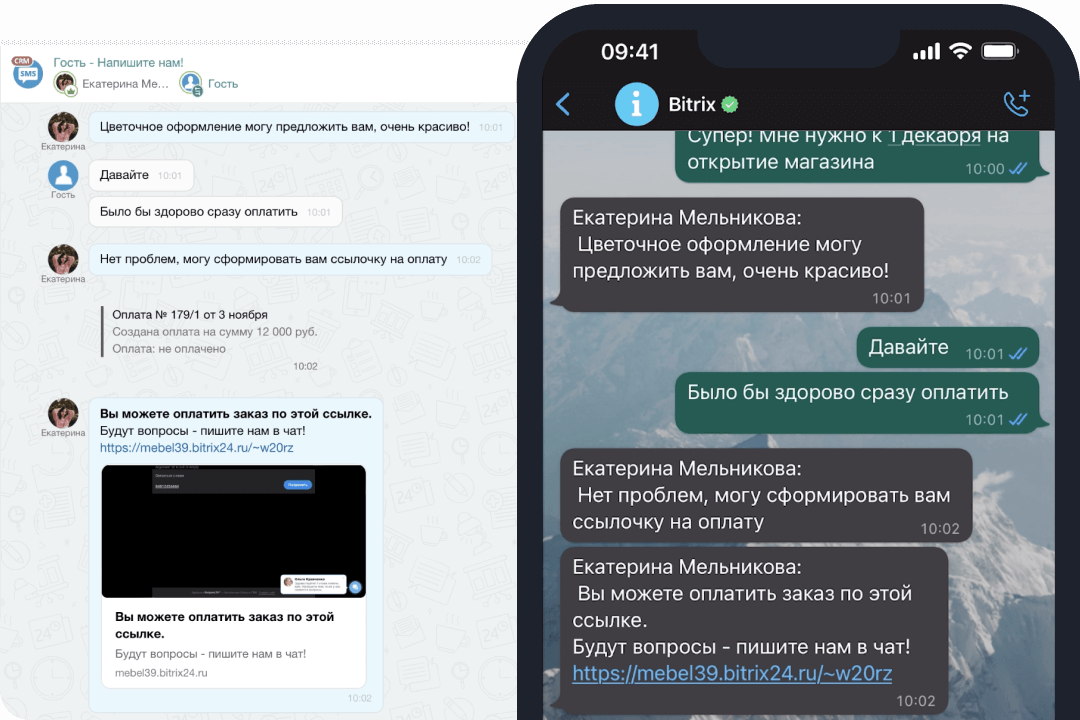 Продавайте клиентам прямо в чатах. Отвечайте быстро, консультируйте, отправляйте ссылку на оплату и оформляйте доставку в CRM.