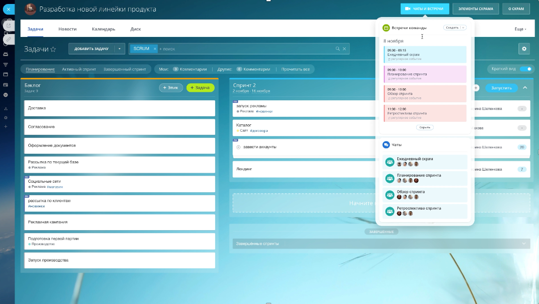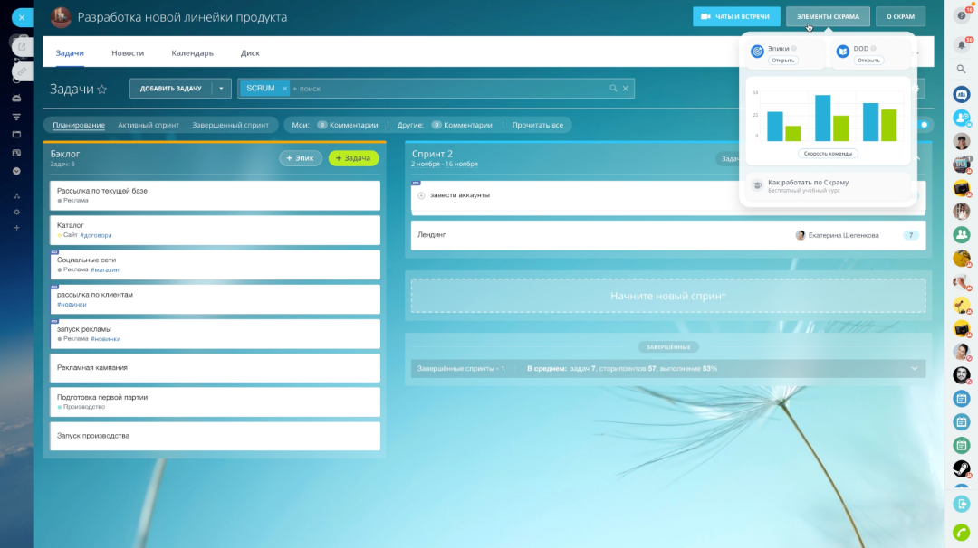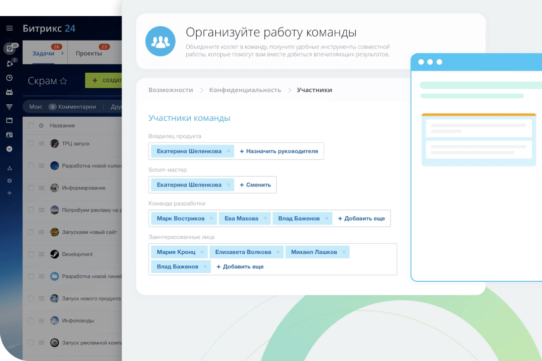 Попробуйте готовый сценарий в Битрикс24, чтобы организовать команду с нуля и сразу же приступить к работе. Вы можете создать до 5 скрам-команд бесплатно.