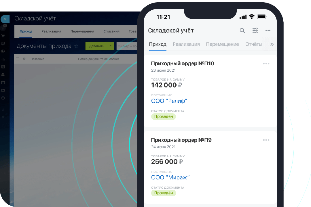 Перемещайте товары между складами, получайте информацию о реализованных товарах и возвратах, оформляйте документы Списания и Реализации.