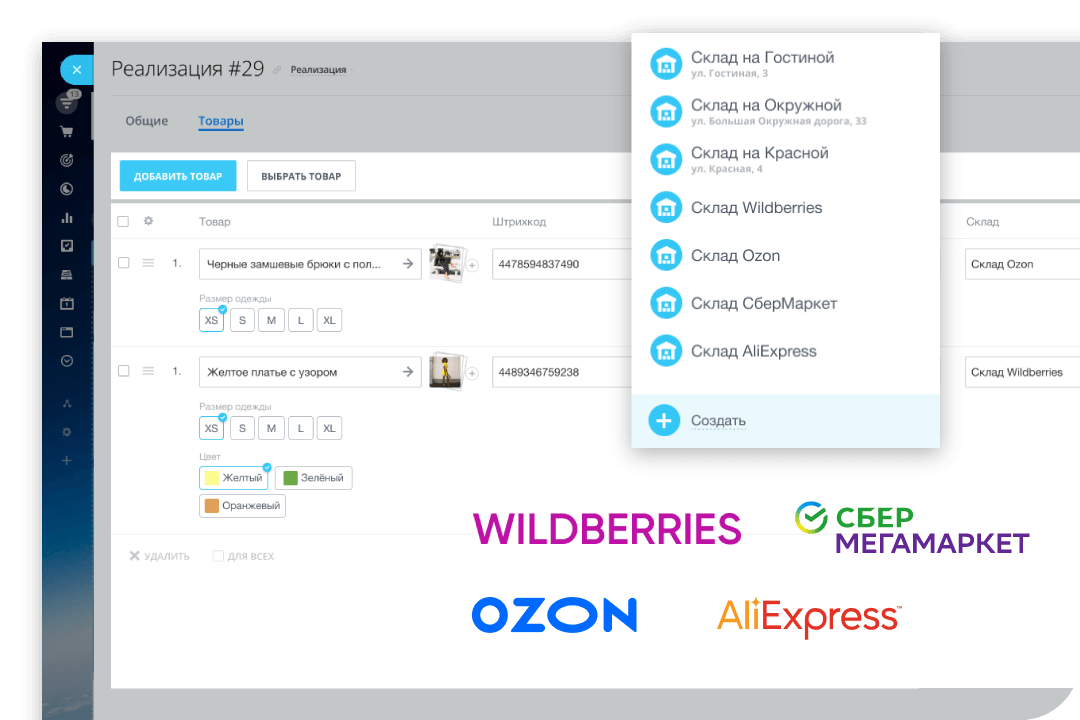 В Битрикс24 уже созданы склады для основных маркетплейсов: Ozon, Wildberries, СберМаркет, AliExpress.