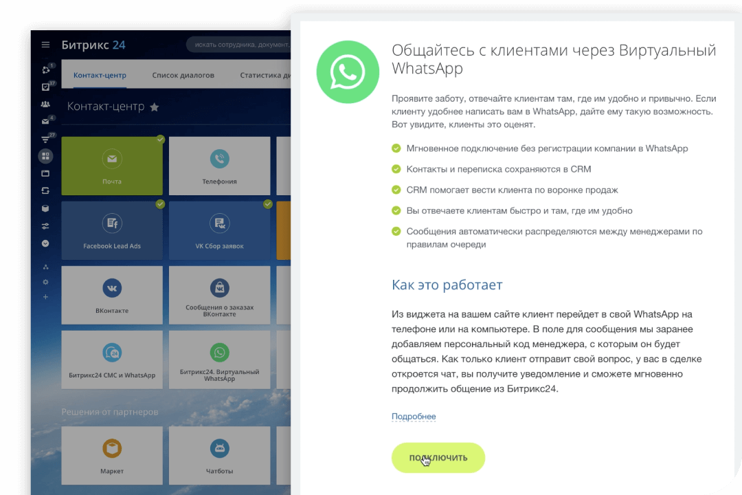 Клиент зашел на сайт и у него остались вопросы? Предложите ему связаться с вами через WhatsApp. Мессенджер уже доступен для выбора в виджете Битрикс24 — вам не нужно ничего настраивать.